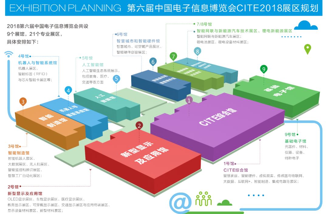 CITE2018超10萬平方米的面積瞄準信息技術最新發展趨勢,展示電子信息全產業鏈。包括:移動智能終端、智能機器人、人工智能、智慧家庭、智能硬件、虛擬現實與增強現實、傳感器與物聯網、大數據、互聯網+、智能制造、新型顯示、LED、集成電路、高端元器件、特種元器件、新能源汽車產業鏈、電子儀器與設備等。其中1號館:CITE綜合館,2號館:新型顯示及應用館,3號館:智能制造館。